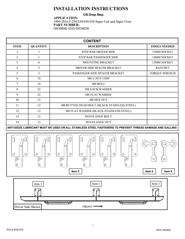 CSI Drop Step side bars are built to last with a solid fully welded construction. The unique aggressive design complements the looks of today modern trucks. A durable corrosion-resistant black powder coated finish keeps them looking their best. The fully welded step plates are sized for solid footing with dimple die stamped tread plates for traction. No drill bolt on installation with mounting kit included. Covered by our 3 year limited warranty.